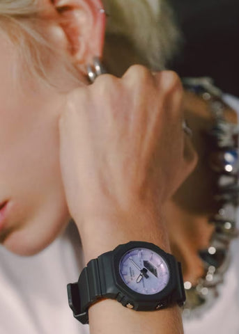 Lighten up your sunny style with a GMA-P2100 watch featuring a polarized color dial. This luxe-look compact timepiece gives off a colorful shine that changes from every angle, and the glossy indexes sparkle with even more impact. The matte-textured bezel and band project a striking, refined counterbalance that highlights the design�s unique brilliance.