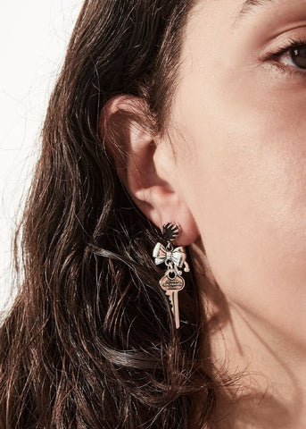 Features:Love Locked Bow Drop Earrings, Mis match style earrings, CHARM SIZE:Lock size:13mm long, Key size:40mm long, STONE:Clear Quartz, STONE SIZE:6mm x 6.5mm, crafted with high polish sterling silver and set with a , Sold as a pair, Secured with a butterfly fastening, One year warranty, comes with a Stolen Girlfriends Club jewellery box
