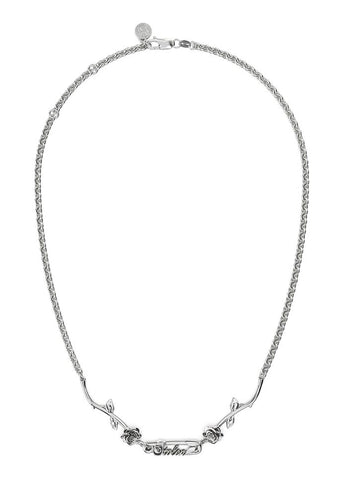 ROSE PIN NECKLACE:Created for Valentine's Day, the Rose Pin Necklace by Stolen Girlfriends Club features an intricate pendant of entwined roses and a sculpted safety pin. Finished with a signature script tag and suspended from a fine cable chain, it blends romantic detail with the brand's distinctive edge.