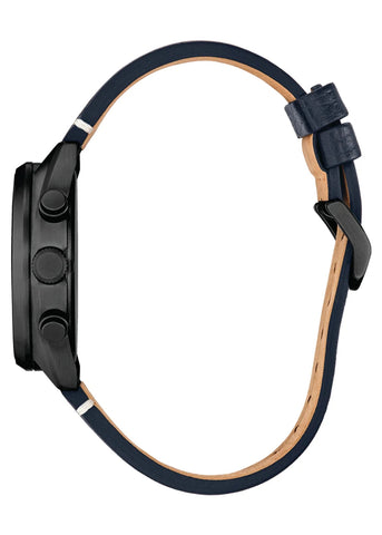 Clean lines, instantly convey a look destined to become a classic. Featuring chronograph, date and sleek blue dial. Crafted with a stylish Black Ion stainless steel case and leather strap. Powered by Eco-Drive technology
