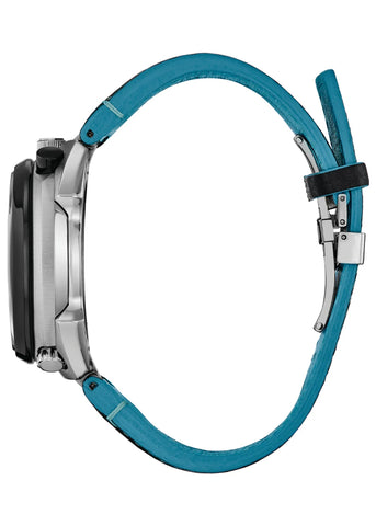 The limited-edition Promaster Tsuno Chrono Racer makes a bold entry into the Promaster Land collection, carrying forward Citizen's racing heritage with a striking new design. Its distinctive chronograph showcases a light blue dial accented in red, housed within a silver-tone stainless steel case. Inside, a hand-assembled movement delivers precision performance, while racing-inspired details set it apart: a power reserve indicator styled like a fuel gauge, and a 60-minute chronograph dial designed to mirror a speedometer. A perforated black leather strap enhances the motorsport aesthetic, echoing classic racing gloves. Practical features include a tachymeter, alarm, and flat sapphire crystal, while water resistance up to 200 metres ensures durability. Powered sustainably by light with Citizen's Eco-Drive technology so it never needs a battery this timepiece captures the perfect fusion of sport, innovation, and style.